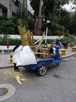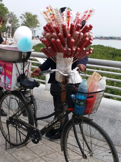 よく見かけるのですが、りんご飴のような赤い串刺しの↖こちら。中身が何なのかわからないのですが、大きさ的にはナツメなのかしら?食べたことがなく、食べる予定もないので謎です(^_^;)この自転車を改造したお店(?)、綿あめもできる設備搭載!しかもカラフル(^▽^)