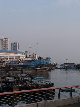 中央左の先端にある白い三角形の建物はフェリーターミナルです。香港やマカオへ行けます。