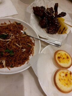 焼きそば、なぜか焼きパイナップルが添えられた甘酸っぱいキチン、チーズタルト、エビ…などなどを注文。
