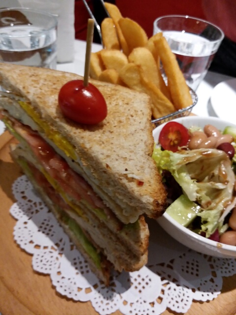 クラブハウスサンドはポテト、バルサミコのかかったサラダもついていますが、中にトマト、レタス、ベーコンにグリルチキンとすごいボリュームで、とても1人で食べきれない感じです!