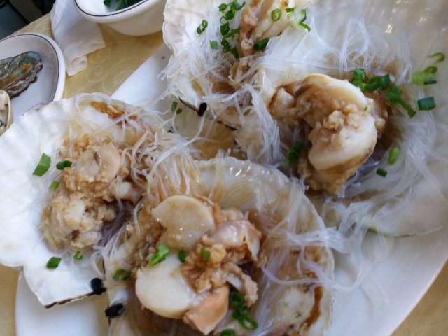 アサリと豆腐のスープはよくある料理です。あと、この↓ホタテにニンニクと春雨を乗せて蒸す料理も定番。エビは希望で普通にゆでてもらいました。醤油につけて食べますが、たぶんこの中国醤油が独特なので、ここらしい美味しさなんでしょうね。