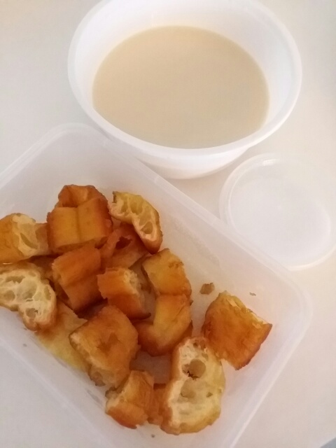 中国で揚げパンと言えばセットで豆乳が付きます。たいていの豆乳は砂糖入り(←これは別添えですね)。甘く温かな豆乳に揚げパンを浸して食べるのが特に朝ごはんでは定番です。