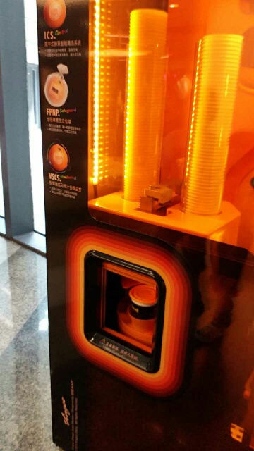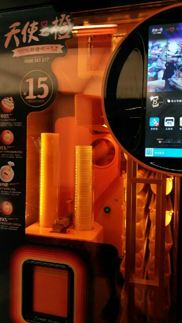 これは、中にオレンジが収納してあり(写真の右はじのいくつも並ぶトレーにコロコロとオレンジが!)、その場で生絞りのジュースが飲めるというもの!!買っている人がいる時、近くを通るとめっちゃいい香り~(*´ω`*)