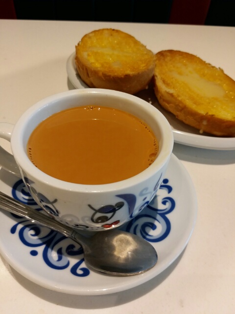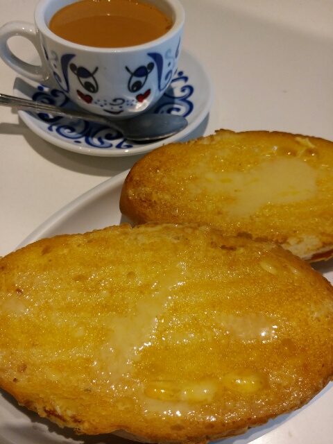 他にも、茶餐庁ではパイナップルパン(日本のメロンパン)にバターのスライスを挟んだものも定番らしいのですが、注文したのはカリカリトーストパンに練乳をかけたというメニュー。