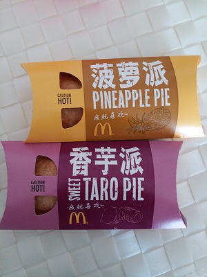 日本のマックにはアップルパイと今の時期は三角チョコパイがありますよね。(個人的にはベーコンポテトパイが大好きだったなぁ…。)こちらには中国っぽいパイがあります。