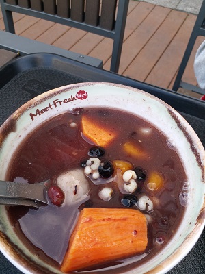 一番好きなのがこのオレンジ色の安納芋のような甘いサツマイモと、タピオカ、芋団子、押し麦の入ったおしるこ。