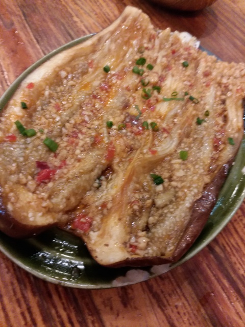 焼きナスなんですが、中国の超長いナスにニンニクと少し辛い感じのタレ?がかけてあるシンプル料理。でもめっちゃトロトロのナスがすごくハマりましたヾ(≧▽≦)ノ