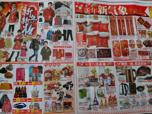 エビとかお肉とか、そして贈り物用のお菓子などなど。また、中国色満載の洋服やお飾りまで…。
