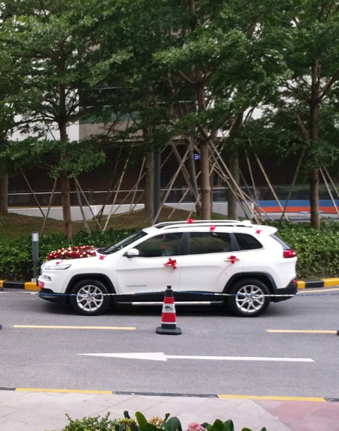 横からの写真でわかりづらいですが、赤いバラでデコレーションされた車です。これは結婚式の新郎新婦が乗る車だそうです。