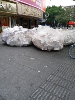 道端にゴミ(全部発泡スチロール)。しかも注目は右横の自転車との対比。