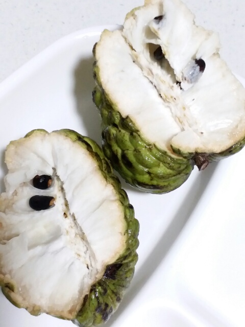 今回は「釈迦頭」です。日本語では「シャカトウ」と言ったり、「バンレイシ」とも言ったりするようです。その名の通り、お釈迦様の頭のようなデコボコとした果物です(*´ω`*)