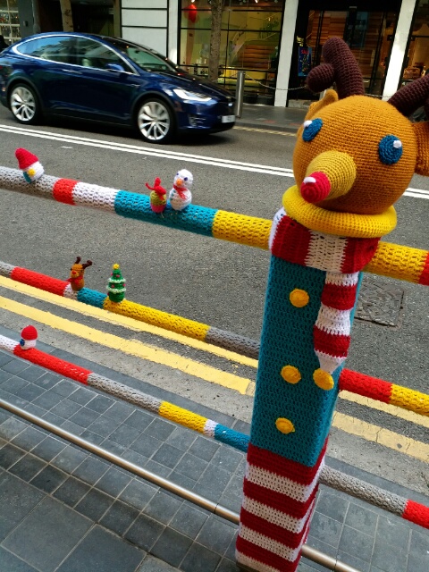 柵をカバーするように手編みの毛糸の編みぐるみの飾りが…(*´ω`*)。かわいい。
