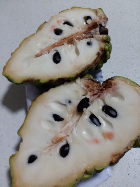 梨のようでいて食感は桃に似ているような…。(前は「豚の角煮」と言ってたぞ;)南国的なフルーティーな感じですが、フワッと柔らかいというか…。そういえば英語だとカスタードアップルなんですね。確かに、そんな感じも?!(…でもカスタードクリームっぽいのを連想する果物だったらドリアンだよな~…。)