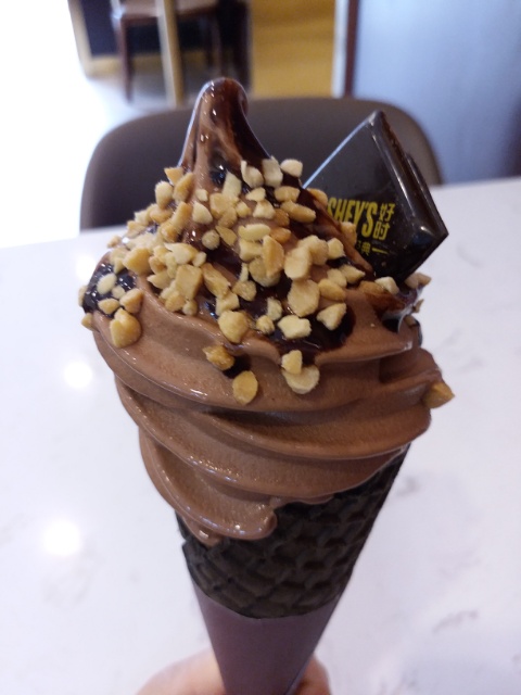 濃厚チョコソフトにハーシーズのチョコシロップ。上にハーシーズのチョコが刺さってコーンもココア。どこまでもチョコ好きのためのソフト。瞬殺で完食でした(^▽^;)