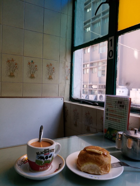 頼んだのはおなじみのメニュー香港ミルクティー20HK$(280円)とバターをサンドしたパイナップルパン(日本のメロンパン)18HK$(250円)