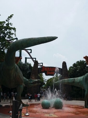 スコールというか、繰り返しの豪雨の洗礼を受け、靴の中はひどいことになり、心が折れそうになりましたが、まだ絶対乗ろうと思っていた「ジュラシックパーク・ラピッド・アドベンチャー」に乗れていないので、ちょっと空くまで頑張ろうと思いました。
