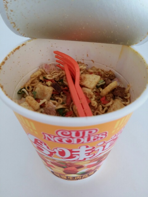 ビーフカレー味。角切りの大きめ牛肉が入っているのが特徴的。(安定のフォークイン・笑)